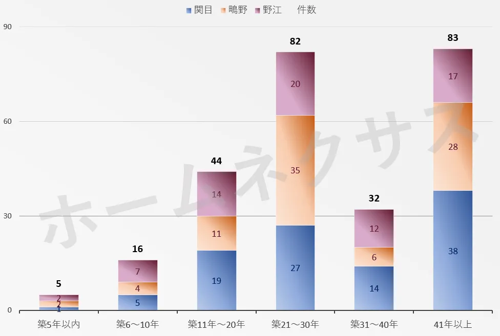 築年数別 × エリア別(関目・鴫野・野江)の件数構成